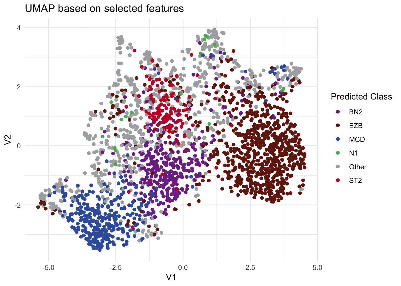 To demonstrate that our approach also works in the original high-dimensional feature space as well as UMAP space, we provide two additional functions: DLBCLone_KNN and DLBCLone_KNN_predict. Unlike the earlier functions, these do not rely on UMAP embeddings. Instead, they call UMAP only to compute pairwise distances in the high-dimensional space, a preliminary step in the UMAP algorithm before applying KNN directly. It’s important not to confuse these with the previously introduced DLBCLone functions, which embed the data in a lower-dimensional space and run KNN on those embeddings. With the earlier functions, users never need to handle the KNN step themselves, since it is built into the workflow. These are not meant for production usage!